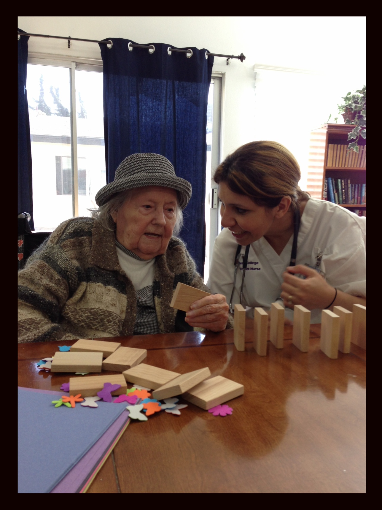 Within the activity, is also student opportunity for observing themselves as researchers and participants. An understanding of “spiritually-emotional intelligence”, or capacity for presence, is experientially understood. The opportunity to be researchers who also collect data and form themes from their facilitated intervention, may encourage enhanced perspective, or capacity for empathy and engagement, aka. S-EI. The idea being, that once students experience the potential for “relationship building”, they can see its value – in (Discuss in post-conference) critical thinking, narration, and story-telling. Out of an i.e.., joyful, nostalgic, or self-identifying encounter for the resident, the students, as observers and participants, gain an awareness of what is both opened and constrained; or, medically speaking, what may surface may be helpful in goals for care. Once experienced by students, when they are professionals in the rut of routine tasks that dictate only 3 minutes to visit, or assess, or assist, those 3 minutes have a reference point, or place of association that knows the meaning of empathic and caring presence. There was reticence in one student bystander, I imagine her to be surprisingly adventurous Day 2.