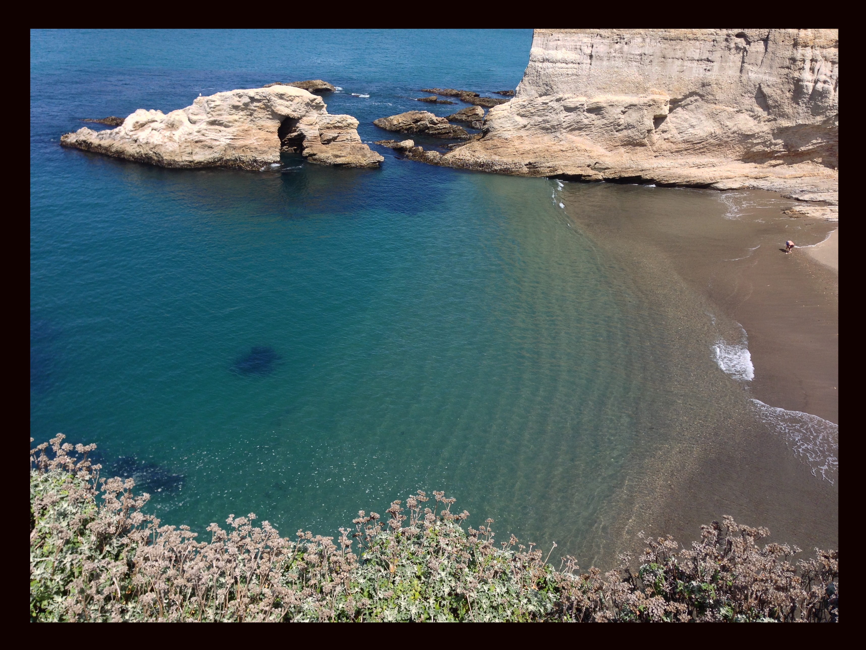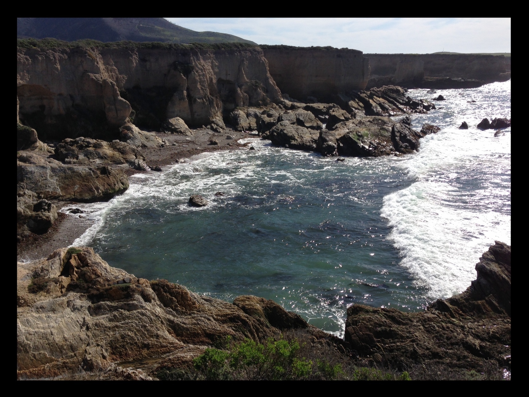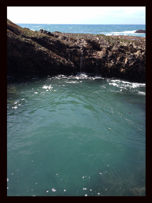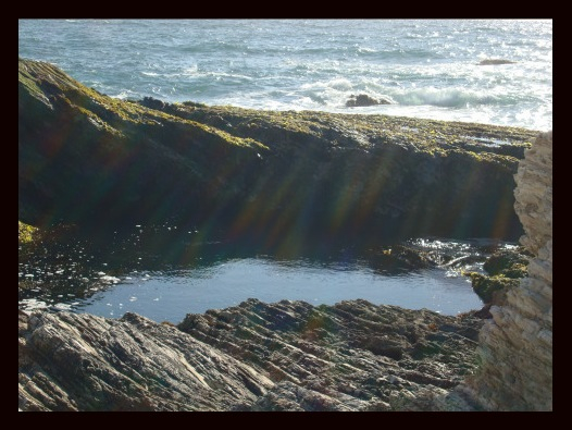 One of my favorite swimming holes in Montana de Oro. The blue-green of the water changes every day. On certain days, I can see clearly, 12 feet below, to the shimmering sand bottom. On other days, the sheen of onyx covets a shark nesting below the surface. I have no way to know if apprehension is the creation of my mind or intuited truth, until a few small fish scurry beneath the surface and relay safety. More recently, I rest my mind on the tide, or stillness, to intuit the welcome of the underworld. I wait for my mind to clear of preconceived thoughts – and Dive! – Breath-stopping cold! I come out of my daily plunge, and climb her rock, as if I have always been here. Ancient breath, rock, ocean and consciousness. Mind, form, and play…